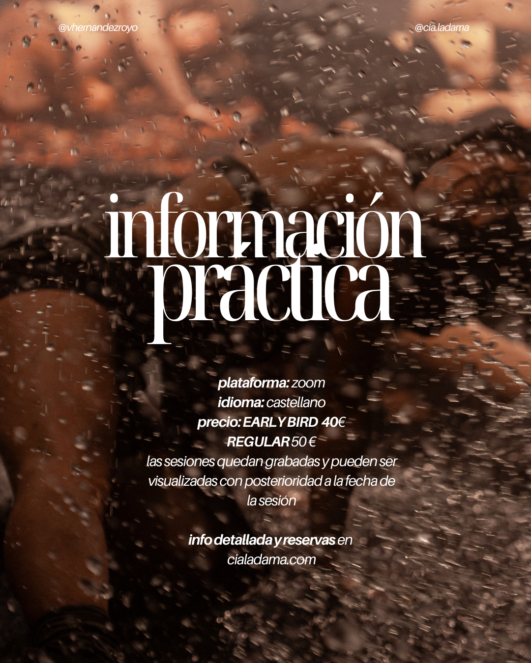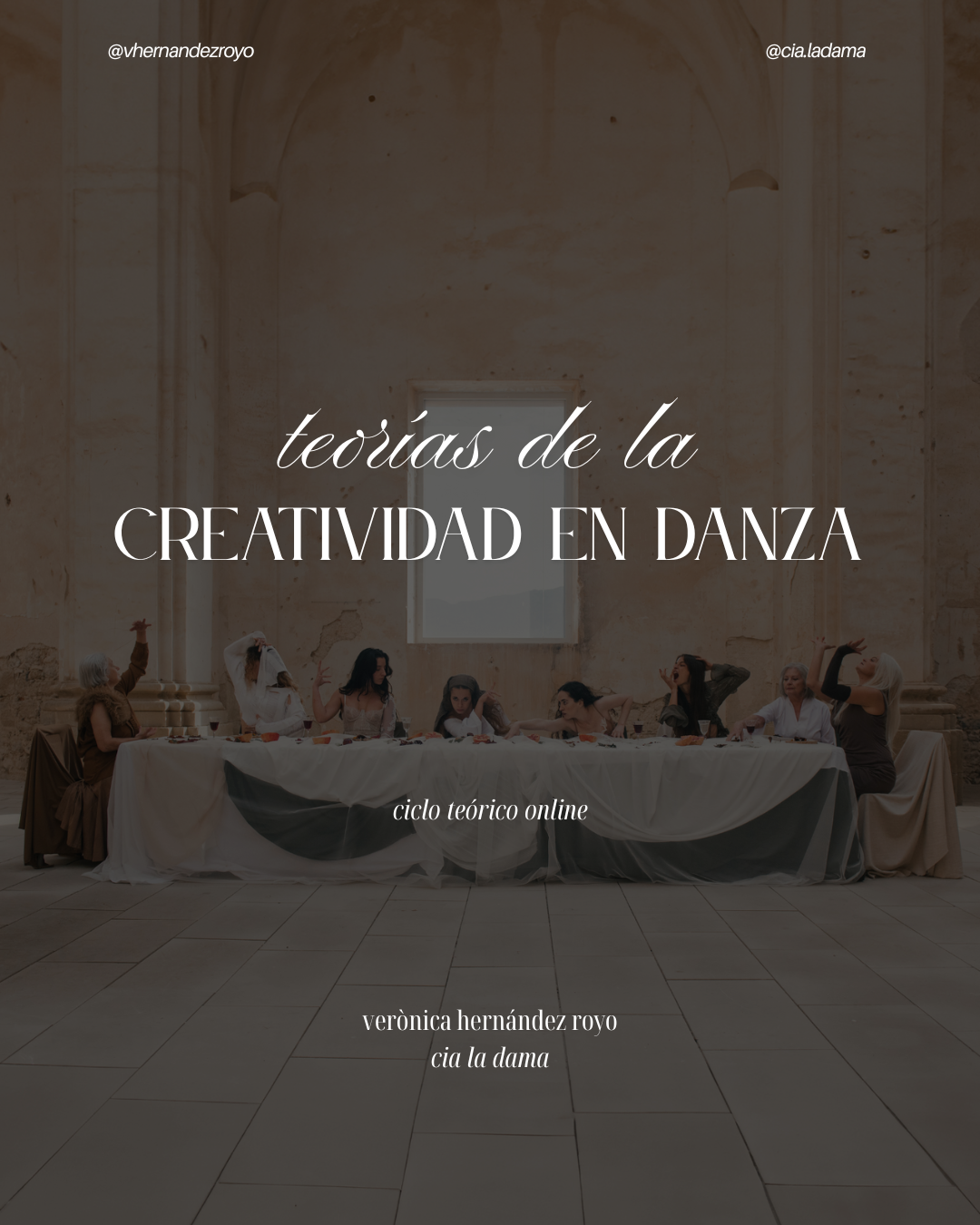 TEORÍAS DE LA CREATIVIDAD EN DANZA: ciclo teórico dividido en cinco sesiones online. Cada sesión está dedicada a un bloque temático que aborda diferentes perspectivas sobre la creatividad en la danza: desde su proceso creativo en ocasiones compartido con otras artes, profundizando en las especificidades e idiosincrasias de la danza y el movimiento, coqueteando con sus viajes hacia y desde la cámara y la pantalla, atendiendo a su proceso interno y viaje del alma hasta su materialización.